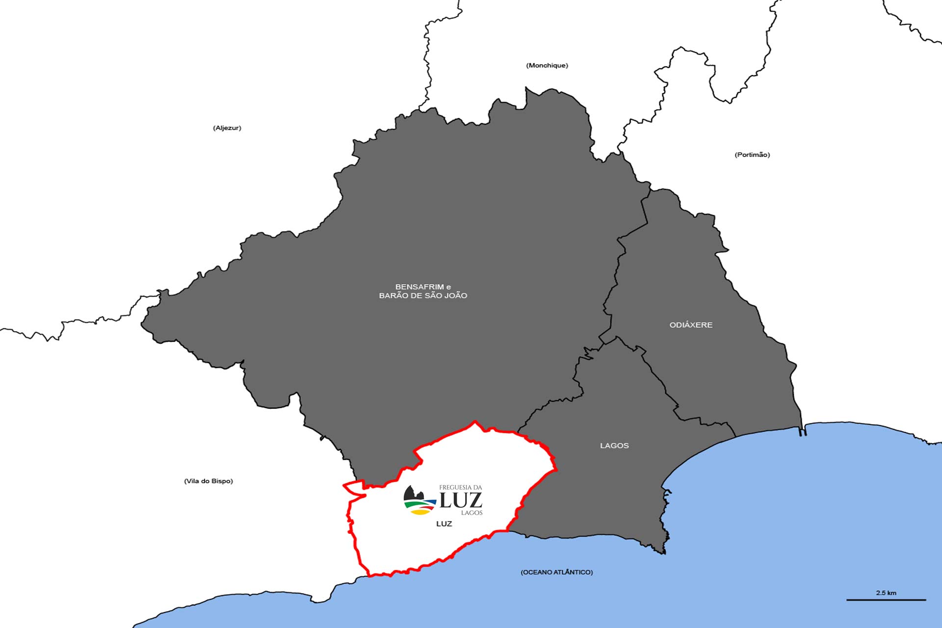 Confronta com as Freguesias de São Gonçalo de Lagos e Barão de São João (Concelho de Lagos), Budens e Barão de São Miguel (Concelho de Vila do Bispo).